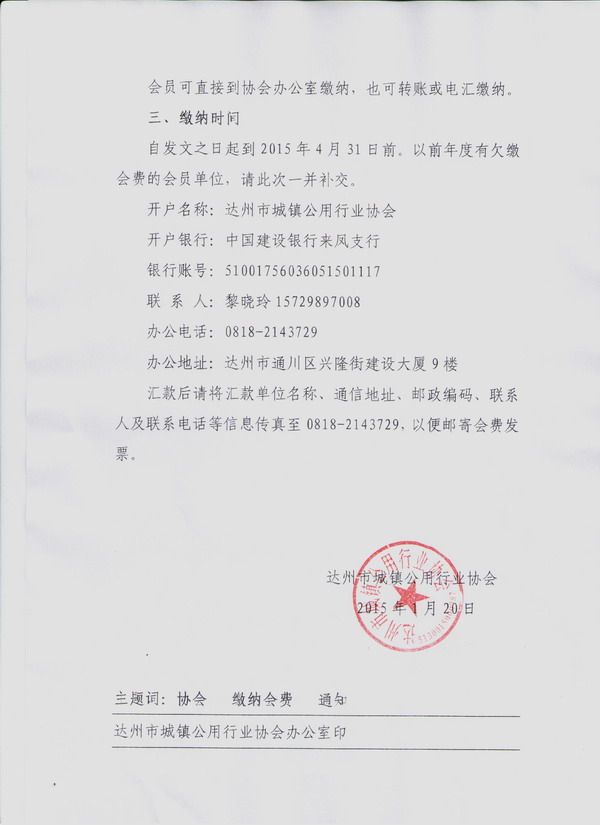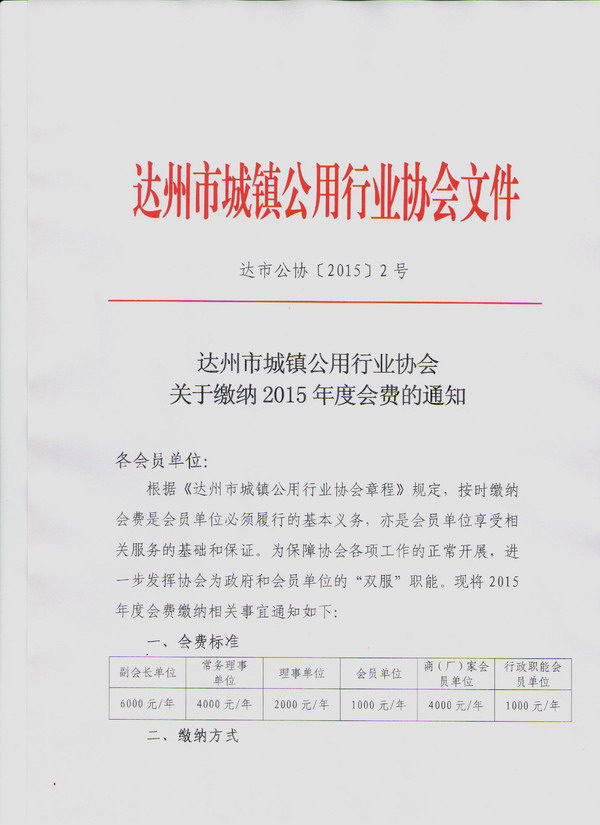 達(dá)州市城鎮(zhèn)公用行業(yè)協(xié)會關(guān)于繳納2015年度會費(fèi)的通知