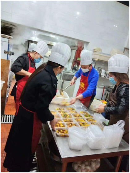 但是,疫情之下,梁遠(yuǎn)軍的心按捺不住的并不是餐館生意的痛苦糾結(jié),每當(dāng)見(jiàn)到新聞鏡頭下全國(guó)醫(yī)療前線(xiàn)、防控隊(duì)伍人員的艱辛付出時(shí),他的心中涌動(dòng)著對(duì)一線(xiàn)人員的無(wú)比心疼,覺(jué)得自己在關(guān)鍵危難時(shí)刻,必須挺身而出,為一線(xiàn)人員、為這個(gè)社會(huì)做點(diǎn)什么。于是,他向相關(guān)部門(mén)申請(qǐng)免費(fèi)為一線(xiàn)人員送餐服務(wù)。每天,他和廚師們積極忙碌地準(zhǔn)備著一份份美味可口的工作餐送上前線(xiàn)。他覺(jué)得,在逆境中選擇前行,沒(méi)有害怕、沒(méi)有退縮,內(nèi)心無(wú)比充實(shí)。