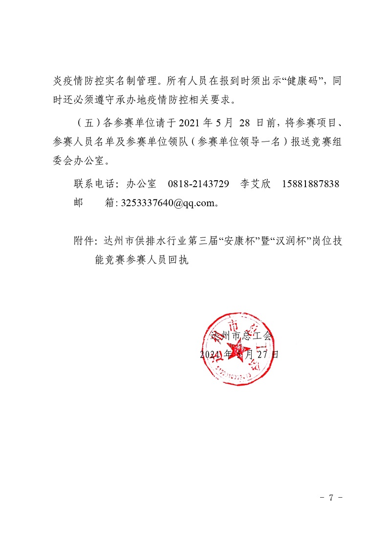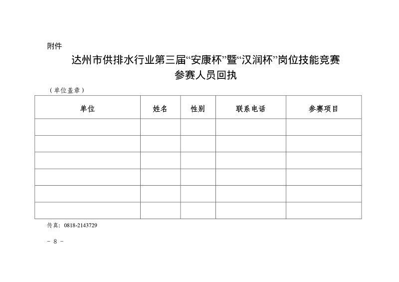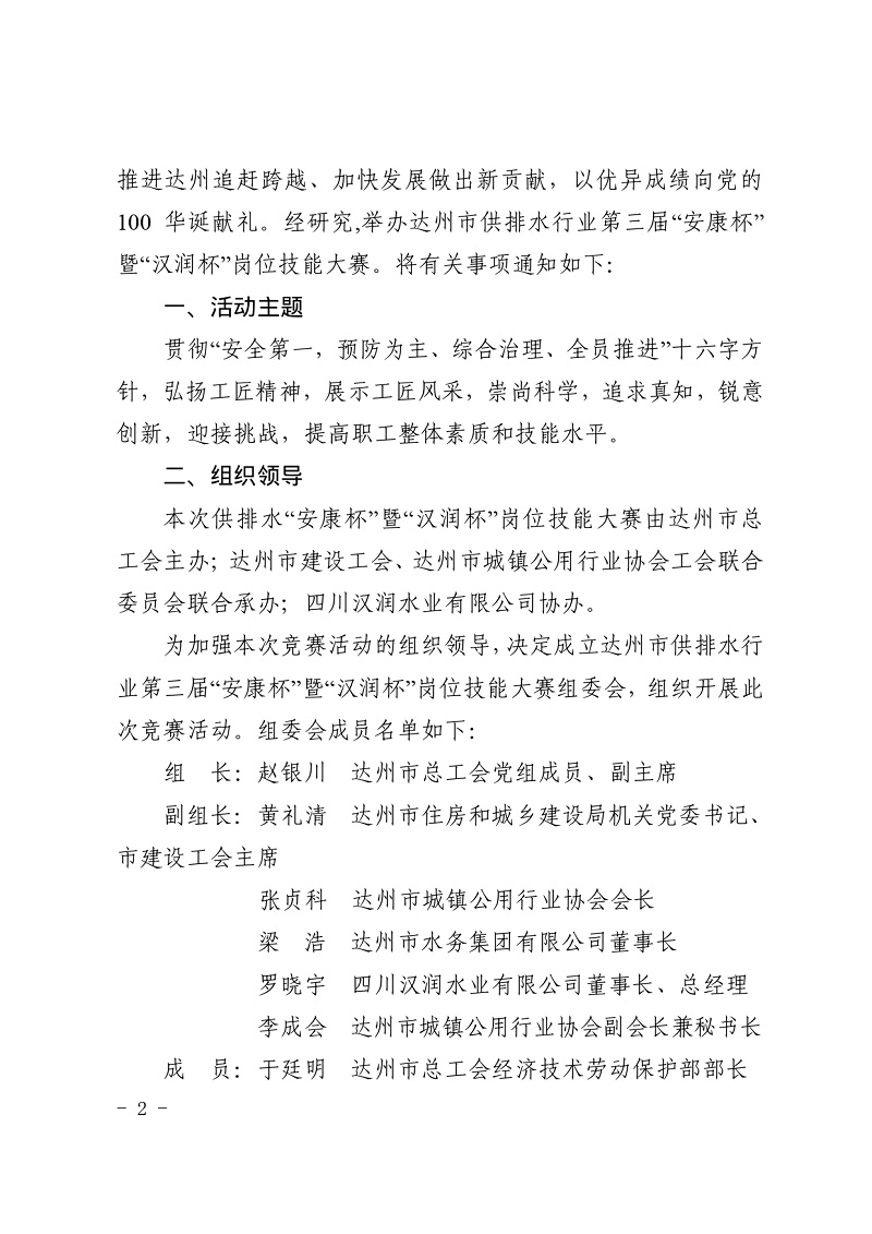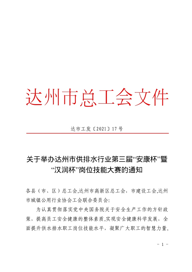 達(dá)州市總工會(huì)關(guān)于開展達(dá)州市供排水行業(yè)第三屆“安康杯”暨“漢潤杯”崗位技能大賽的通知