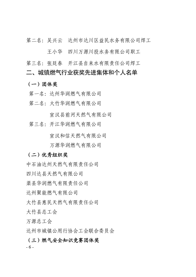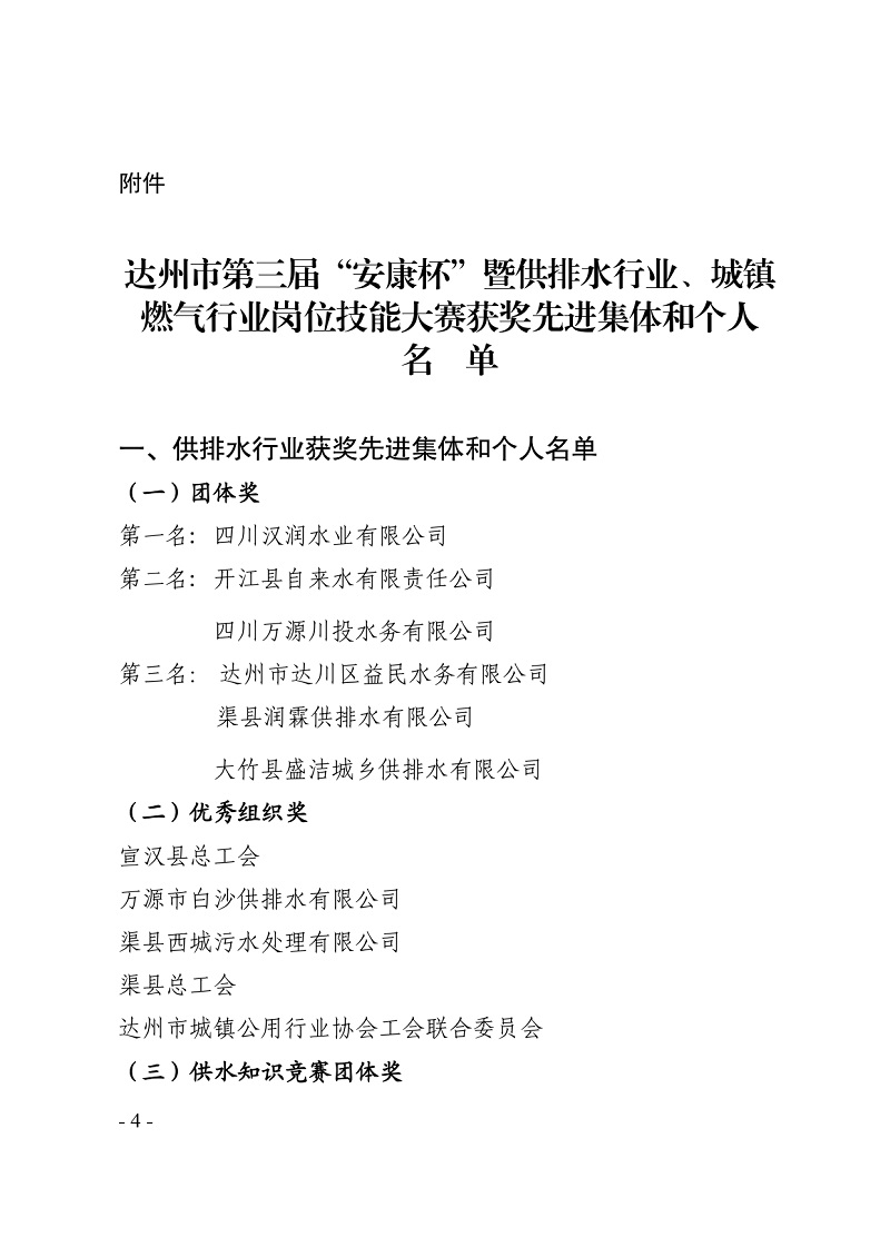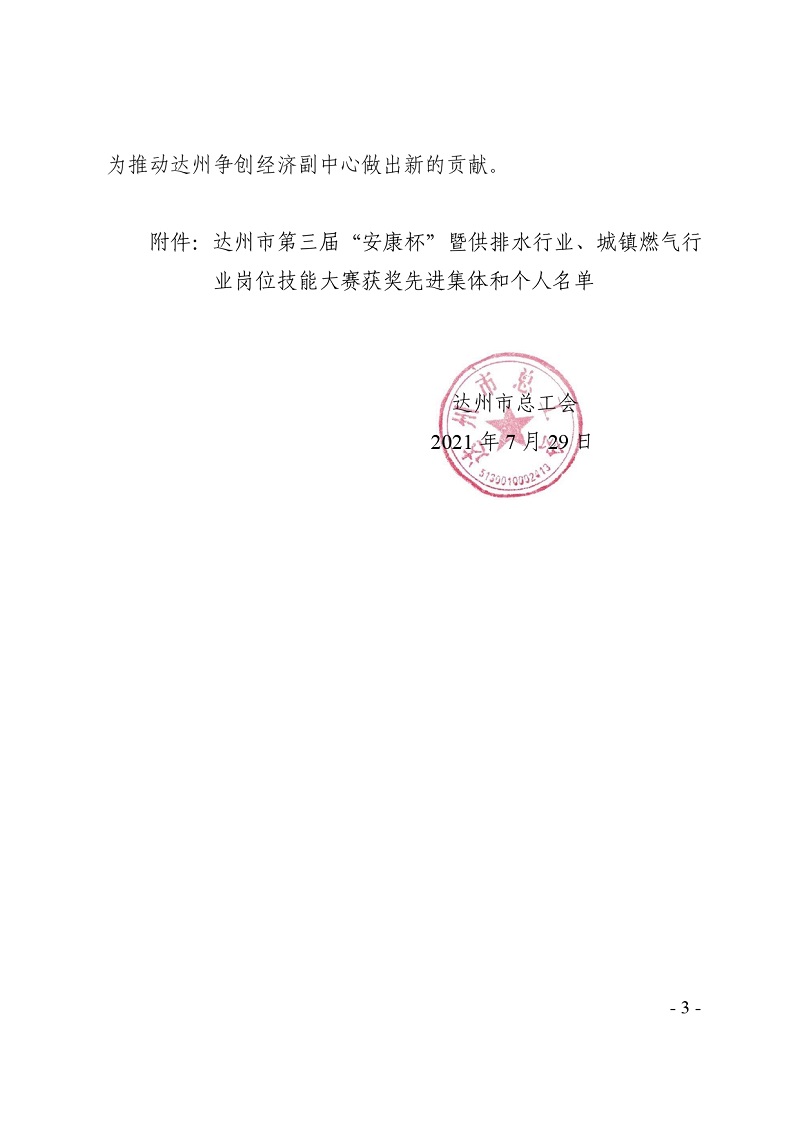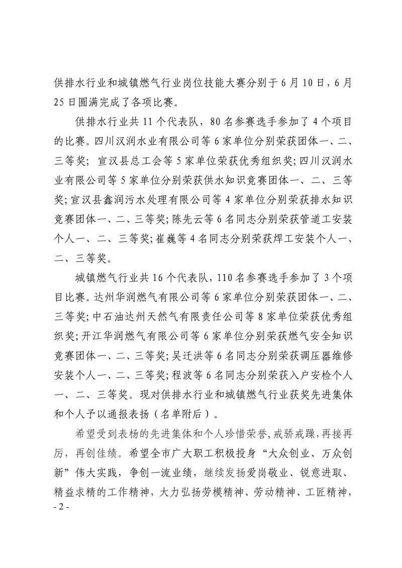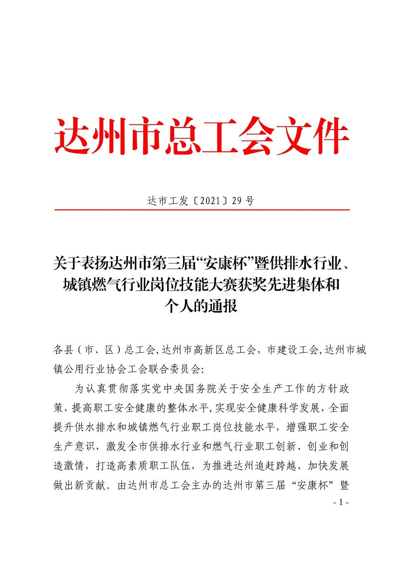 關于表揚2021年第三屆全市安康杯暨供排水行業(yè)、城鎮(zhèn)燃氣行業(yè)崗位技能大賽獲獎先進集體和個人的通報達市工發(fā)〔2021〕29號