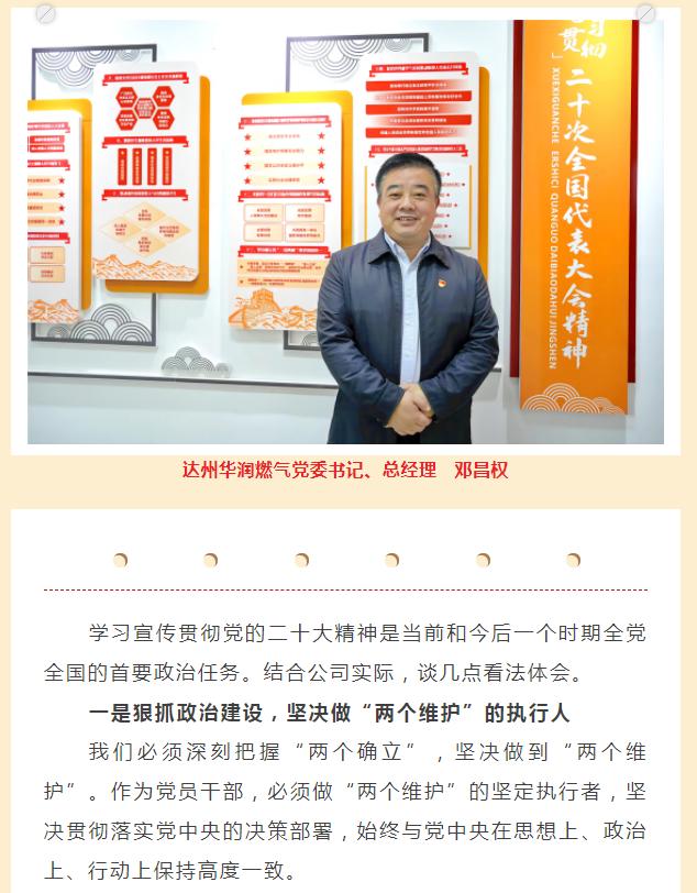 黨的二十大召開以來,達(dá)州華潤燃?xì)恻h委以高度的政治自覺,統(tǒng)籌各級黨組織和廣大黨員干部,將學(xué)習(xí)宣傳貫徹黨的二十大精神作為首要政治任務(wù),全方位多層次寬領(lǐng)域推進(jìn),迅速掀起學(xué)習(xí)宣傳貫徹黨的二十大精神熱潮,為推動公司高質(zhì)量發(fā)展凝聚智慧和力量。