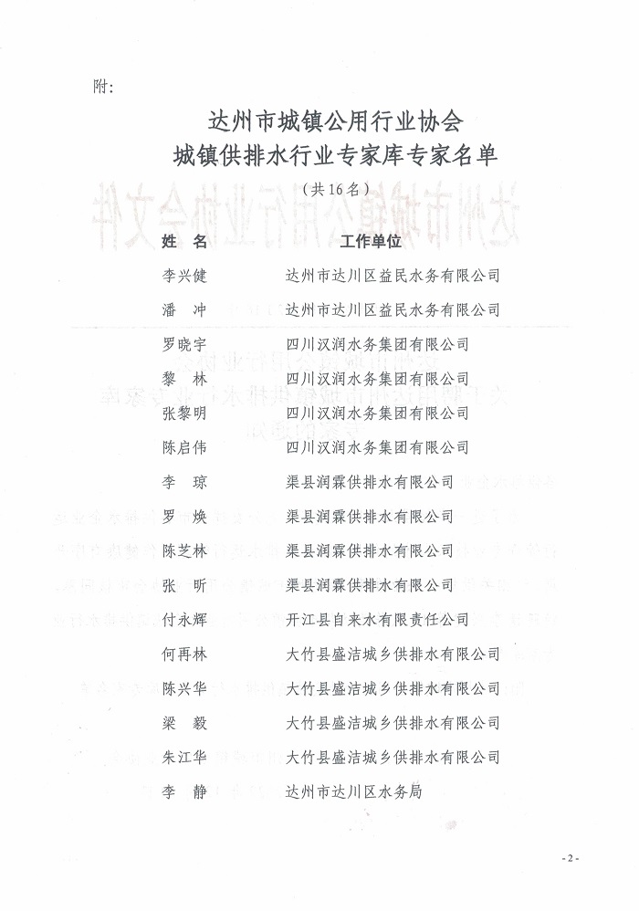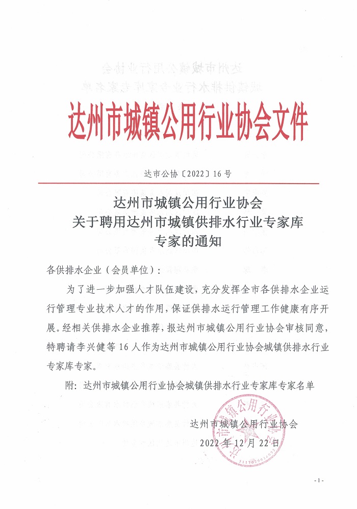 達州市城鎮(zhèn)公用行業(yè)協(xié)會關于聘用城鎮(zhèn)供排水專家的通知