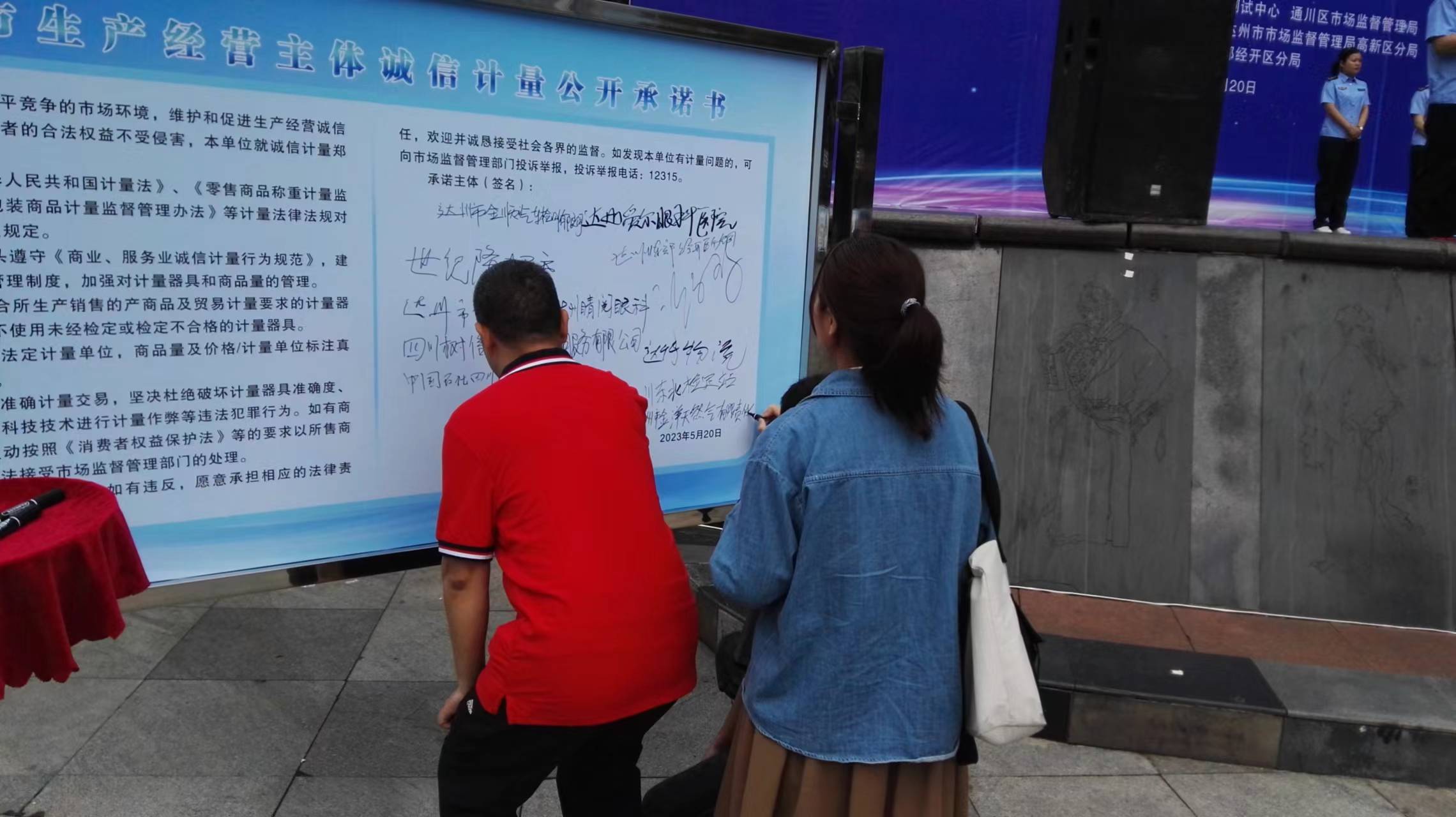 今年的活動(dòng)主題為“計(jì)量助力中國式現(xiàn)代化”,上午9時(shí)整,由市局陳果副局長宣布“達(dá)州市5.20世界計(jì)量日廣場集中宣傳活動(dòng)開始”。首先,中石油達(dá)州銷售公司就加油站計(jì)量作誠信計(jì)量承諾倡議,世紀(jì)隆超市負(fù)責(zé)人代表超市行業(yè)作計(jì)量承諾倡議。其次,參展企業(yè)代表在誠信計(jì)量承諾墻上進(jìn)行了簽名。最后,參展企業(yè)與達(dá)州市局、各區(qū)局領(lǐng)導(dǎo)一道觀摩現(xiàn)場展板,了解到全市產(chǎn)業(yè)計(jì)量服務(wù)現(xiàn)狀,企業(yè)計(jì)量未來服務(wù)發(fā)展趨勢,領(lǐng)悟到計(jì)量在助力中國式現(xiàn)代化中的積極作用。
