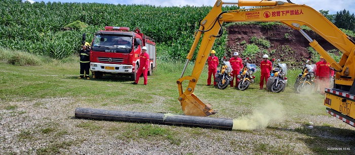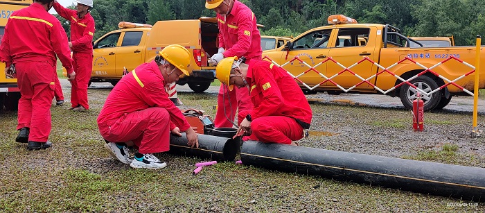 演練模擬了南壩調(diào)壓計(jì)量站后端DN200中壓主干線(xiàn)被第三方施工隊(duì)在施工過(guò)程中損傷,造成天然氣泄漏事故。面對(duì)突發(fā)事故,應(yīng)急隊(duì)伍反應(yīng)迅速,現(xiàn)場(chǎng)搶修組第一時(shí)間趕赴現(xiàn)場(chǎng),及時(shí)關(guān)閉上、下游閥門(mén);救援組立即操控消防車(chē)對(duì)外泄天然氣進(jìn)行了水霧狀控制,防止意外引燃天然氣;隨后技術(shù)組對(duì)環(huán)境檢測(cè)達(dá)標(biāo)后,現(xiàn)場(chǎng)搶修組駕駛集等離子切割、電焊、發(fā)電、挖掘、空壓設(shè)備及抽水等多功能于一體的專(zhuān)用應(yīng)急搶險(xiǎn)車(chē)實(shí)施了搶修作業(yè)。從接警、指揮與協(xié)調(diào)報(bào)告、現(xiàn)場(chǎng)處置,到搶險(xiǎn)完畢、安全恢復(fù)供氣等各環(huán)節(jié)緊張有序進(jìn)行,有效檢驗(yàn)了中壓天然氣管道泄漏應(yīng)急預(yù)案的實(shí)用性、可操作性。
