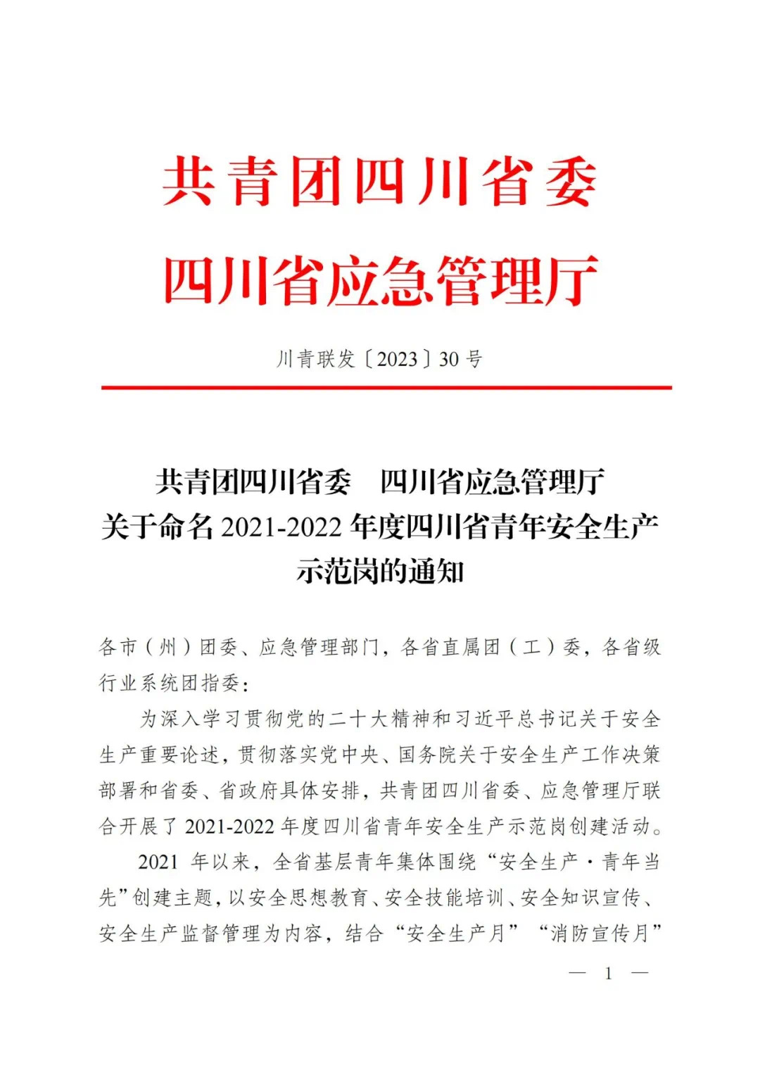 近日,共青團(tuán)四川省委、四川省應(yīng)急管理廳聯(lián)合印發(fā)了《關(guān)于命名2021—2022年度四川省青年安全生產(chǎn)示范崗的通知》,開江華潤燃?xì)庥邢薰緫?yīng)急搶維中心“榜上有名”。