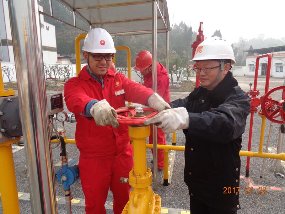 上午11點(diǎn),廟壩站放散點(diǎn)置換工作準(zhǔn)備就緒,福成寨站內(nèi)來自大竹作業(yè)區(qū)計(jì)量班和調(diào)壓班的10名專家也共同完成了通氣前的最后一次檢查、調(diào)試工作。隨后,大竹作業(yè)區(qū)副總汪陽和大竹華潤燃?xì)庥邢薰靖笨偫讓W(xué)建共同擰開了燃?xì)忾y門,伴隨著“嗤、嗤”的氣流聲,置換工作準(zhǔn)時(shí)開始。12點(diǎn)38分,從廟壩監(jiān)控點(diǎn)傳來消息,檢測儀顯示的數(shù)據(jù)已達(dá)到置換方案的要求,置換合格,本次天然氣置換工作順利完成。