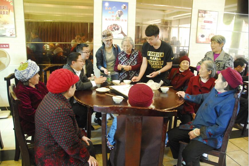 二、關(guān)愛空巢老人,綻放青春風(fēng)采。隨后,團(tuán)員們集體來到位于東湖公園的福榮城敬老院,為老人們送去節(jié)日的慰問和貼心的問候。大家同老人們圍在桌子旁一起包餃子、下棋、閑話家常,整個飯廳其樂融融。老吾老以及人之老,大家熱情的干勁、歡快的笑聲感染了老人,老人們的臉上都洋溢著幸福的笑容。