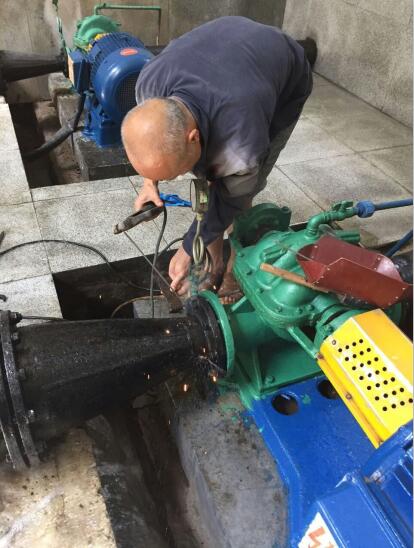 泓霖供水公司竹陽水廠維修電機(jī)保供水。7月20日上午11時,竹陽水廠機(jī)房工作人員上報,水廠75KW水泵運(yùn)行后,與供水管道連接的大小頭管件漏水嚴(yán)重,接報后,公司立即組織機(jī)修人員前往檢查維修。
