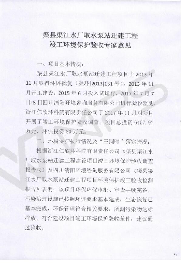 2017年12月18日,渠縣供水排水總公司組織環(huán)評(píng)單位(成都市環(huán)境保護(hù)科學(xué)研究院)、設(shè)計(jì)單位(渠縣供排水總公司)、施工單位(渠縣供排水總公司)、驗(yàn)收調(diào)查單位(浙江仁欣環(huán)科院有限責(zé)任公司)及渠縣環(huán)境監(jiān)測站3名專家(名單附后)組成驗(yàn)收組對渠縣渠江水廠取水泵站遷建工程建設(shè)項(xiàng)目竣工環(huán)境保護(hù)情況進(jìn)行了現(xiàn)場核查驗(yàn)收。驗(yàn)收組對建設(shè)項(xiàng)目現(xiàn)場進(jìn)行了認(rèn)真核查,聽取了建設(shè)單位對工程環(huán)境保護(hù)落實(shí)情況的匯報(bào)及“三同時(shí)”執(zhí)行情況的匯報(bào),結(jié)合驗(yàn)收調(diào)查報(bào)告,經(jīng)認(rèn)真討論形成以下意見: