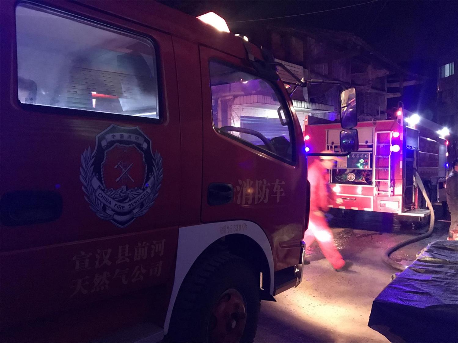 南壩鎮(zhèn)消防中隊(duì)接到報(bào)警后立即趕赴現(xiàn)場(chǎng)救援。由于起火民房屬木質(zhì)結(jié)構(gòu),大火迅速蔓延。南壩鎮(zhèn)消防中隊(duì)請(qǐng)求宣漢縣前河天然氣有限公司派遣消防車及人員趕往現(xiàn)場(chǎng)增援。前河天然氣有限公司接到請(qǐng)求后,火情就是命令,從公司總經(jīng)理到消防員,一刻也不敢耽擱,立即啟動(dòng)消防搶險(xiǎn)應(yīng)急預(yù)案,并在總經(jīng)理鄭玄同志的帶領(lǐng)下,組織消防車及義務(wù)消防隊(duì)員趕赴火場(chǎng),迅速加入滅火施救工作中。經(jīng)過1個(gè)多小時(shí)的激烈救援,終于在4點(diǎn)許將火勢(shì)控制,避免了更大的災(zāi)情發(fā)生。