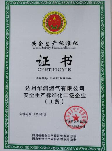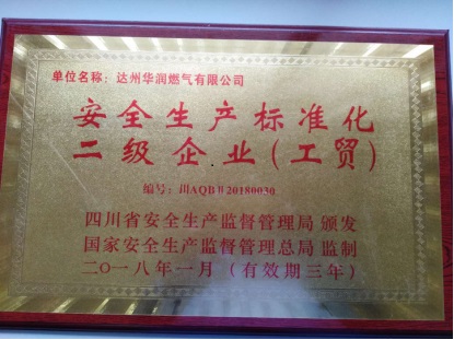 近日,達州華潤燃氣有限公司被四川省安全生產(chǎn)監(jiān)督管理局授予“安全生產(chǎn)標準化二級企業(yè)(工貿(mào))”獎牌和證書。