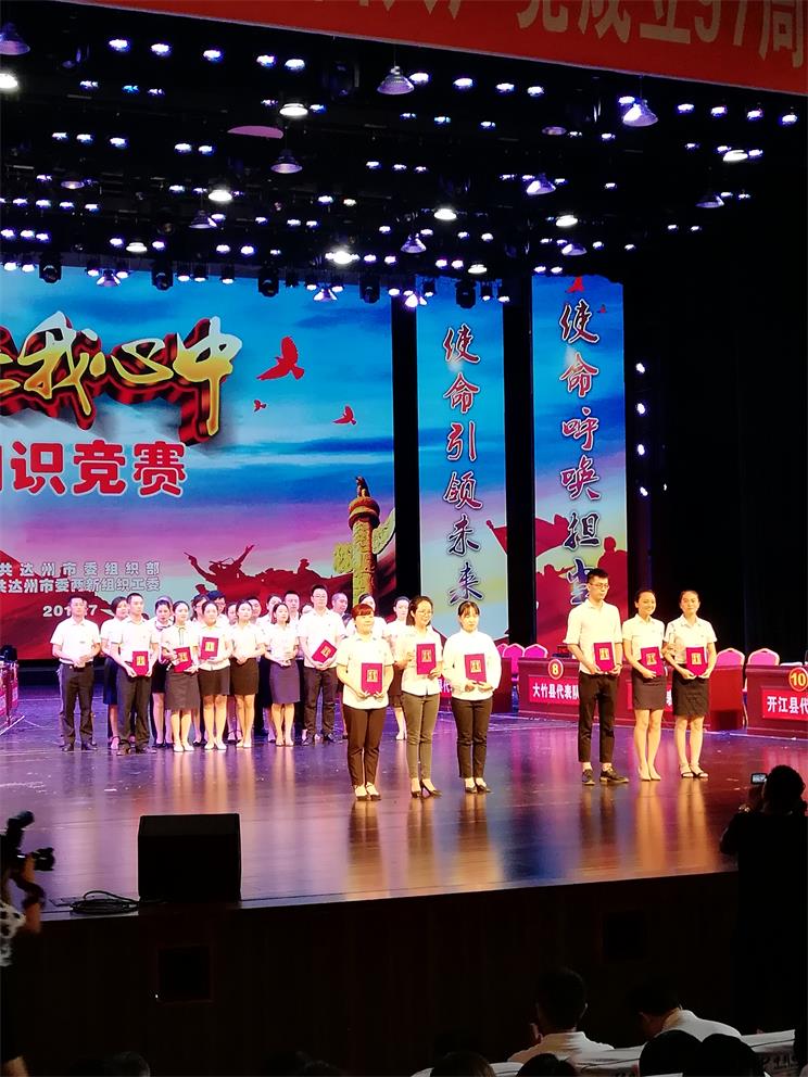 快訊 為慶祝中國共產(chǎn)黨建黨97周年,7月2日,達(dá)州市兩新組織在巴山大劇院隆重舉行了“黨在我心中”知識競賽決賽。達(dá)州市城鎮(zhèn)公用行業(yè)協(xié)會聯(lián)合黨支部朱芳玲(四川森博能源有限公司職工),黨建指導(dǎo)員、市委統(tǒng)戰(zhàn)部經(jīng)濟(jì)科科長黎秋,市現(xiàn)代物流行業(yè)協(xié)會副書記向琦等三同志代表市社會組織第二綜合黨委參加了知識競賽決賽,通過緊張激烈的競賽,獲得了二等獎的優(yōu)異成績,為社會組織第二綜合黨委和本單位爭得了榮譽。