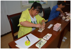賽場上,有的用單指單張點鈔法、有的用多指多張點鈔法,有的用扇面點鈔法,選手們各展其才,互不示弱。一張張紙幣在選手們手中上下翻飛,令人看得眼花繚亂。現(xiàn)場氣氛緊張又激烈,評委及觀摩人員都暗暗地為選手們捏了一把汗。點鈔劵清點完畢后,裁判及工作人員按規(guī)則進行審查評分。經(jīng)過兩個多小時的角逐,最后,客戶服務部的王立容技高一籌,以12分鐘8秒全部正確的成績拔得頭籌。