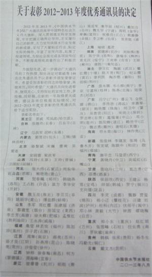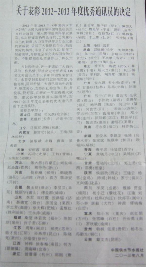 今年3月,鄧小林、唐毅和常向波等三人被省水協(xié)表彰為優(yōu)秀通訊員,公司也被省水協(xié)連續(xù)10年表彰為通聯(lián)工作先進單位;8月鄧小林、唐毅又獲中國水協(xié)主辦的中國供水節(jié)水報社表彰為優(yōu)秀通訊員,在四川省8家獲表彰的供排水企業(yè)12人中,大竹水司是唯一榜上有名的縣級供水企業(yè)。