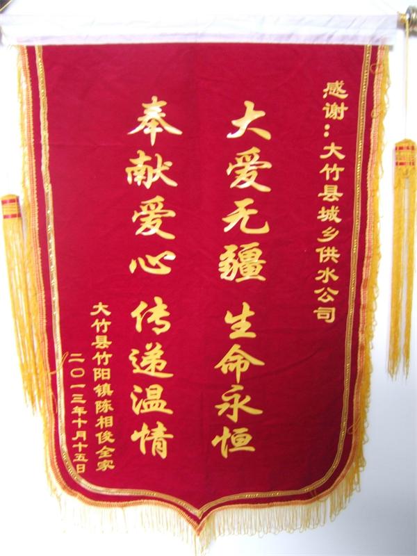 錦旗致謝大竹供水人。近日,大竹縣白血患兒陳相俊之父,將一面印有“奉獻(xiàn)愛心傳遞溫情、大愛無疆生命永恒”的錦旗送到了供水公司,表達(dá)感激之情。