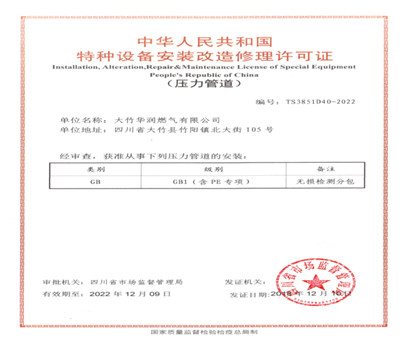 12月10日, 公司成功取得由四川省市場監(jiān)督管理局頒發(fā)的GB類GB1(含PE管專項)特種設(shè)備安裝改造修理許可證。
