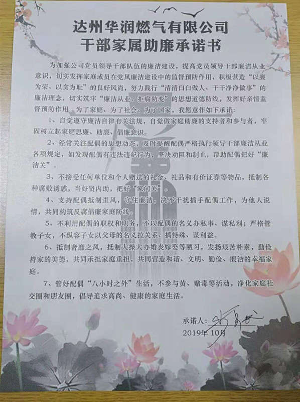 論家庭“賢內(nèi)助”。10月29日,公司召開了“親情喚廉潔 家庭倡新風(fēng)”座談會,向全體員工發(fā)出了《來自華潤燃?xì)獾囊环饧視,公司中層以上管理人員、關(guān)鍵崗位員工及其家屬60余人出席。利用親情的感召力量,及時(shí)扯耳朵、拉袖子、早提醒,打好拒腐倡廉的“親情牌”。