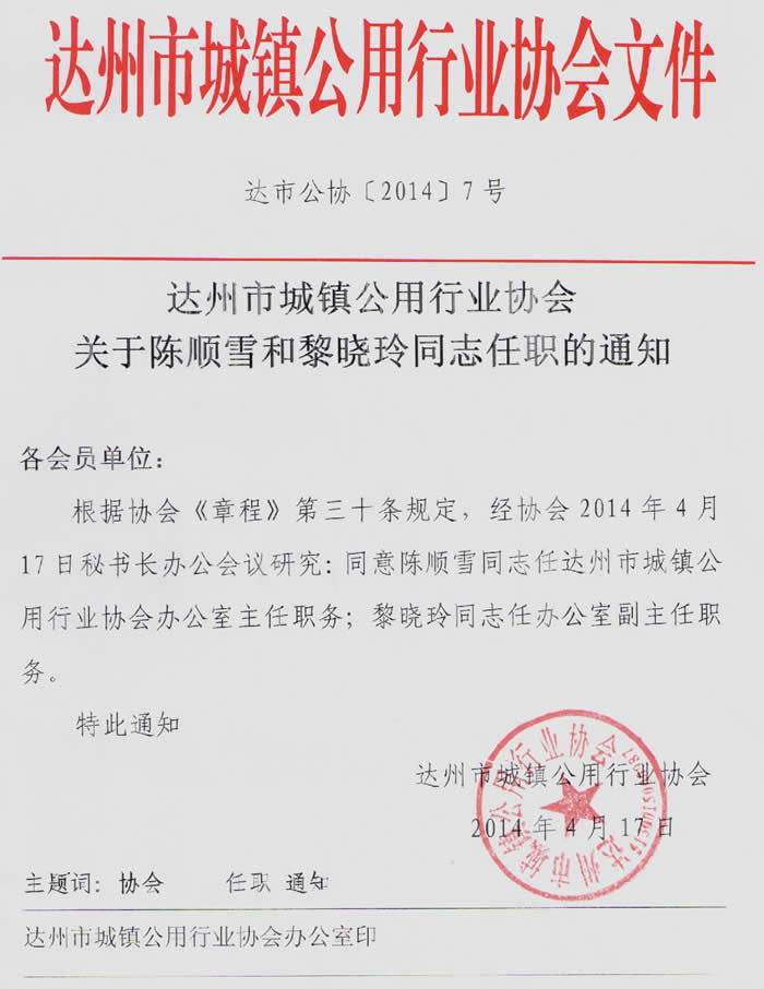 達州市城鎮(zhèn)公用行業(yè)協(xié)會關于陳順雪和黎曉玲同志任職的通知