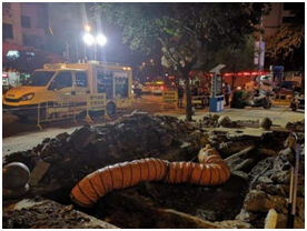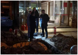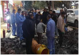 時間回放到12月4日上午8點(diǎn)40分,公司接到用戶報警,“洞天大酒店門口異味嚴(yán)重,疑似天然氣泄漏”。警情就是命令,搶險人員立即趕赴現(xiàn)場確認(rèn)險情。通過初步查勘,現(xiàn)場無施工痕跡,周邊窨井可燃?xì)怏w濃度已達(dá)到爆炸極限,情況十分危急。公司接到現(xiàn)場反饋后,立即啟動搶險應(yīng)急預(yù)案,迅速增派人員趕到燃?xì)庑孤﹨^(qū)域,10余名搶修人員各司其責(zé),疏散區(qū)域人員、建立警戒區(qū)域、布置警戒力量和消防設(shè)備、打探測孔、查找泄漏點(diǎn)、監(jiān)測周邊濃度、確定燃?xì)饴c(diǎn)、開啟鼓風(fēng)置換裝備、實施開挖等工作有條不紊地同步進(jìn)行。因漏氣現(xiàn)場各種管線(水、電、氣、通訊等)錯綜復(fù)雜,掩埋介質(zhì)都為混凝土,周邊窨井、下水道濃度在爆炸極限內(nèi),無法機(jī)械破碎開挖。