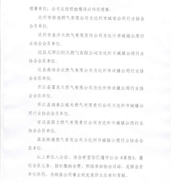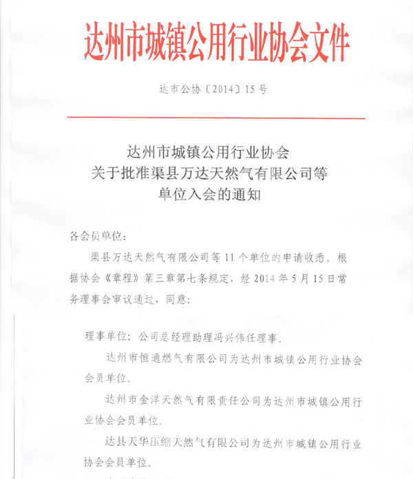 關(guān)于批準(zhǔn)渠縣萬(wàn)達(dá)天然氣有限公司等單位入會(huì)的通知